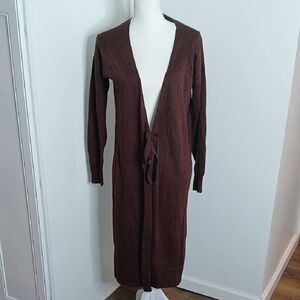 Elegant brown cardigan. Open front with tie closure. Long sleeves and knee-length design. Perfect for layering.