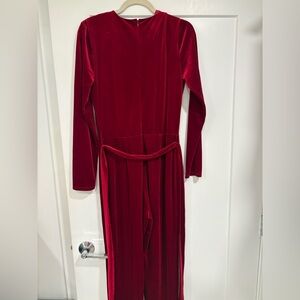 Chic velvet robe with a deep red hue. Perfect for cozy evenings. Features a flattering wrap design. Worn to a holiday party once.
