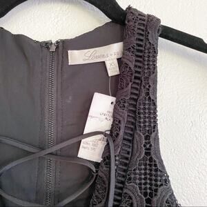 New with tags Lovers + Friends Escape Front Tassel Lace-Up Crochet Knit Dress. A sleeveless crochet knit dress with back zip details, front lace-up tassel detail and scalloped hem to complete stylish evening outfit. V-neck, allover crochet detailing. Lined.