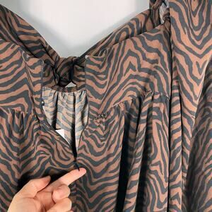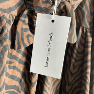 NEW Lovers & Friends Fai Mini Babydoll Dress in Jules Tiger Brown Black Long Sleeve, Bow Front Detail, Twill Fabric, Sz S