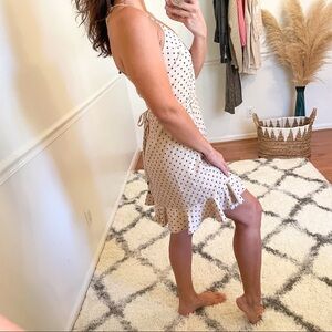 Lovers + Friends Gigi Star Wrap Mini Dress in Cream & Black. Women's Size Small. Poly/rayon, light chiffon, fully lined, wrap front with tie closure, spaghetti strap, ruffle trim, back keyhole with tie closure, cream, and black star print. Approximate measurements: 14" chest, 33" length (measured flat). Excellent pre-owned condition, no visible flaws.