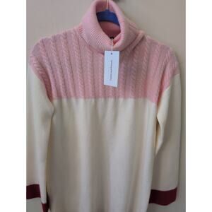Look as sweet as you are with the Lovers + Friends Kane Sweater Dress. Bold cherry red and bubble gum pink pop against a soft ivory base that features cable knit accents along the neckline and shoulders.