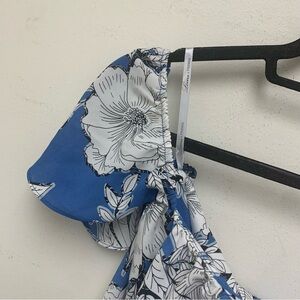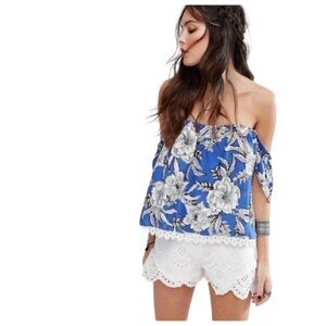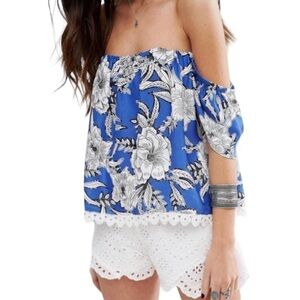 Beautiful Lovers + Friends Off Shoulder Top In Riviera Floral. Off shoulder styling leads into split back. Boned bodice. Back zipper. White lace trim. Sold on Revolve.