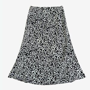 This skirt brings bold energy with its monochrome leopard print and flattering A-line silhouette. Lightweight woven fabric with a subtle sheen adds movement, while the midi length offers versatile styling—perfect with sneakers, boots, or heels.