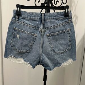 These blue jean shorts from Lovers + Friends feature a distressed design with frayed hems, offering a relaxed and casual vibe. Crafted from traditional denim, they provide a fitted silhouette through the hips and thighs, perfect for a laid-back summer look.