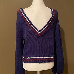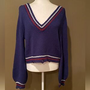 Lovers + Friends Navy Cropped Sweater Size Large V Neck