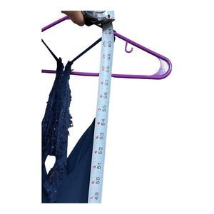 Elegant navy maxi dress. Features a deep V-neck, gorgeous lace detail across semi-open back. Perfect for gala and holiday party season.