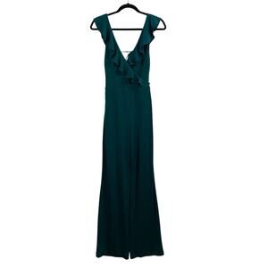 The Lovers + Friends New Green Jumpsuit in size XS features a ruffle surplice V-neck design with a zip and tie back closure, making it perfect for a variety of occasions including weddings, parties, or casual wear.