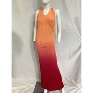 Stunning halter maxi dress. Gradient orange to pink design. Perfect for elegant occasions.