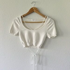 features: rayon & cotton blend, strappy design, lightweight knit fabric, wrap around adjustable tie detail, cropped, short sleeve