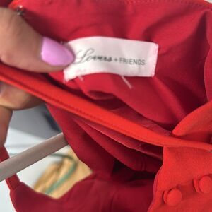 The Lovers + Friends red jumpsuit is a stunning piece that combines elegance with comfort. Featuring a sleeveless design and a fitted bodice, it offers a flattering silhouette. The wide-leg pants and tapered waist create a flowy, relaxed fit, perfect for making a bold statement at any event.