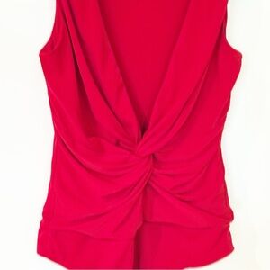 Chic red bodysuit with a twist front. Sleeveless design for versatile styling.