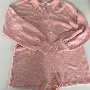 Preowned. Romper is very gently worn. Looks new. Super cute!! Detailed Partial front button closure. French terrycloth. Light pink! From Revolve. Size small
