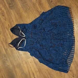 Details about the item: basket weave cut away 3d flowers textured cut away woven waist Royal Blue Floral Double Lined over black Strappy V Neck bust garden tea party homecoming