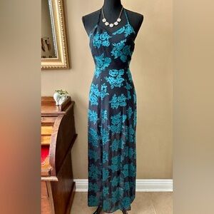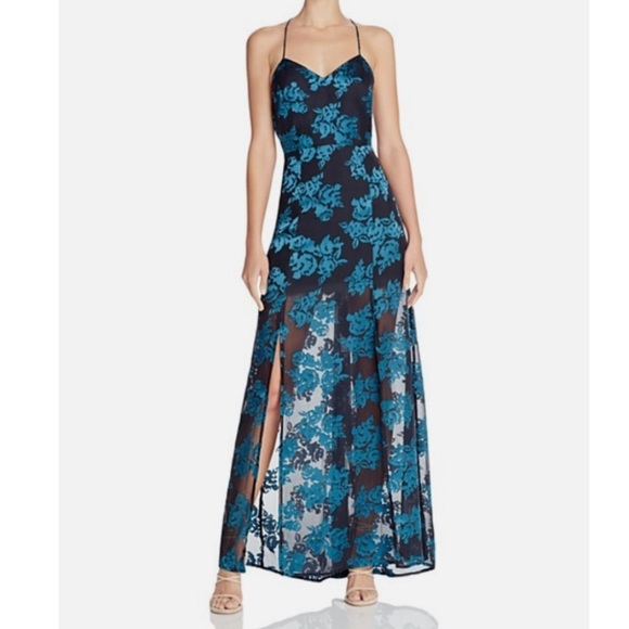 This black and green/blue floral Sevilla maxi dress from Lovers & Friends features a burnout / applique floral design in jade green / blue satin over sheer black chiffon with an open plunging t-back, v-neckline, and two sexy slits at front.