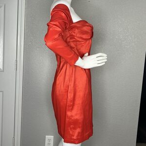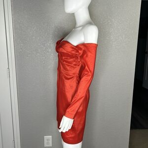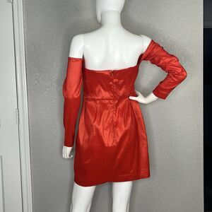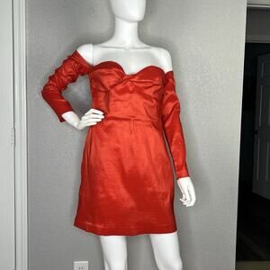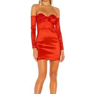 Lovers + Friends Alaya Off The Shoulder Dress in a vibrant orange-red hue. The dress features a sweetheart neckline, long sleeves, and a zip closure at the back. The off-the-shoulder design accentuates your décolletage and adds a touch of elegance to the overall look.