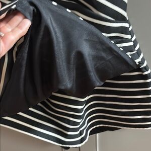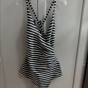 "Lovers + Friends Jayla Romper" dress in a black and white striped pattern. This garment is characterized by its halter neckline, wrap-style front, and mini-length skirt with a subtle slit. It combines the appearance of a dress with the practicality of a romper, as it includes attached shorts underneath the skirt layer. Lovers + Friends is a brand known for its contemporary and stylish women's clothing. The "Jayla Romper" is one of their popular designs, often sought after for its chic and versatile look.