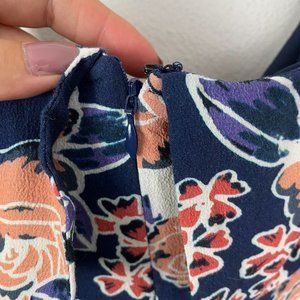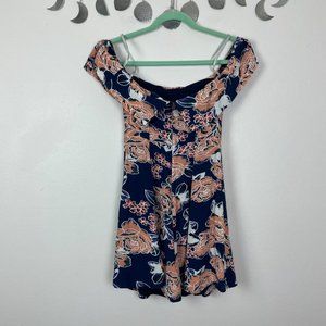 Extra small off the shoulder mini dress in navy blue with pink and white florals. It has faux buttons down the front and a zipper closure in the back. The off the shoulder sleeves have elastic in them to keep them in place. This is a fit and flare dress from Lovers and Friends.