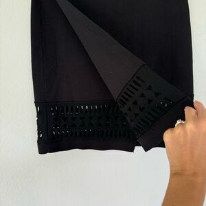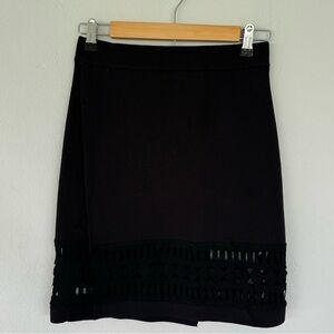 Lovers + Friends black laser cut out design trim faux wrap style stretchy spandex blend knit pencil skirt size small