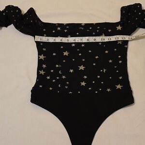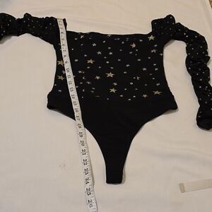 Black and gold star thong bodysuit. Sheer long sleeves. sexy and flattering. great pre-owned condition. please see photos for measurements. Questions? Leave a comment below!