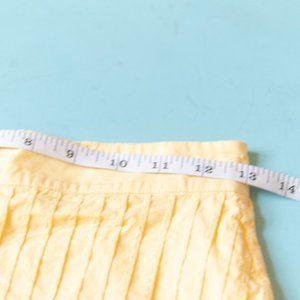 Features: Bright pale yellow high waisted folded pleated mini skirt with ruffle flared hem and button front closure.