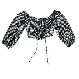 Features- black and white gingham crop top has an elasticized band at waist, with an adjustable tie designed as a halter neckline vs a bow at bust.