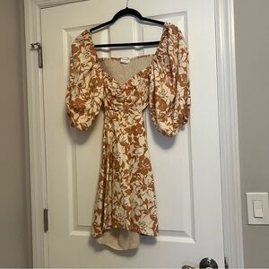 Embrace elegance with this floral puff sleeve dress. The orange and white pattern adds a vibrant touch to your wardrobe. Perfect for any occasion.