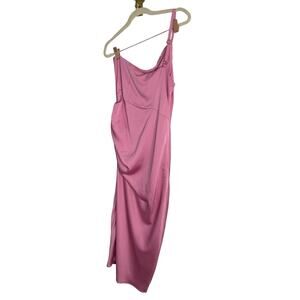 The Lovers and Friends Amina Midi Dress in Pink features a luxurious satin fabric with a stylish one-shoulder design and a chic side slit.