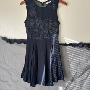 Embrace your tumblr era indie sleaze style in this Lovers + Friends black mini dress. It has a mesh top with a bust lined floral applique detail, fit and flare skirt, and a back zipper closure. The dress has a little stretch. Super cute! Pair it with some platform lace up heeled boots and a cropped jacket.