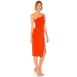 With the Lazo Midi Dress, Lovers + Friends delivers juicy minimalism and an easy to style silhouette. This tangy orange midi dress features one shoulder styling and elongates your frame with its perfectly centered leg hem. Fully lined. One adjustable shoulder strap. Hidden back zipper closure. Polyester / spandex. Dry clean only. Still available on the Revolve website for full price. LFD368 U18. In preowned condition.