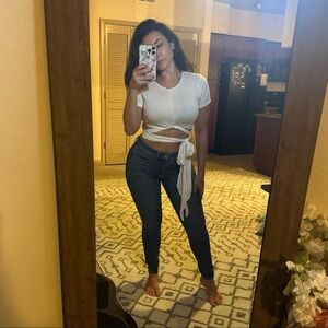 Short sleeve cropped wrap top that can be tied in the front or back. White with a versatile fit. One sleeve has tiny holes as shown in photos, and price reflects this.