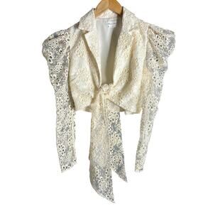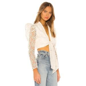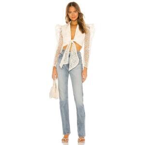 Lovers + Friends Kenter Top in Cream. Size S / Small. Features notch lapel collar, long sleeves, puffed shoulders, front tie closure, eyelet detail throughout, and cropped length. Style LFS753 R19. Self: 50% Polyester, 50% Nylon ground with 100% Cotton. Lining: 100% Polyester. Excellent condition, no flaws.