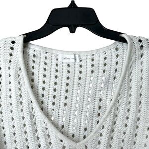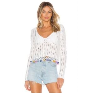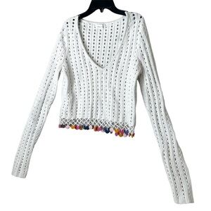 This Lovers + Friends sweater is a must-have for all seasons. The white open-knit design is accented with vibrant and colorful trim, making it perfect for adding a pop of color to any outfit.