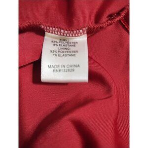 Polyester and spandex, velvet, beautiful red, sleeveless, straps are spaghetti and are not adjustable, v neck, A line silhouette, midi length, good condition and quality