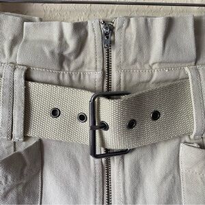 Self: 100% cotton.Lining: 100% rayon. Made in China. Hand wash. Front zipper closure. Detachable waist belt. 4-pocket styling. Paperbag waist.
