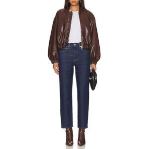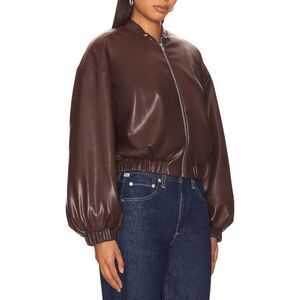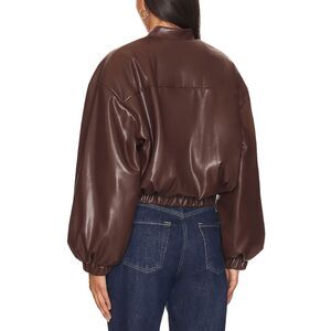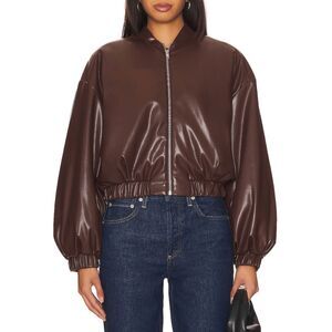 Lovers and Friends Ana Faux Leather Bomber Jacket in rich brown. Crafted from puff faux leather fabric, this jacket promises style and warmth for a versatile addition to your wardrobe.