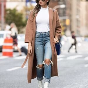 Lovers and friends knit cardigan tie coat. Worn a couple times: some piling throughout. Also a tiny pull. Both seem to be fixable. Includes belt. See photos for rough measurements.