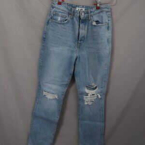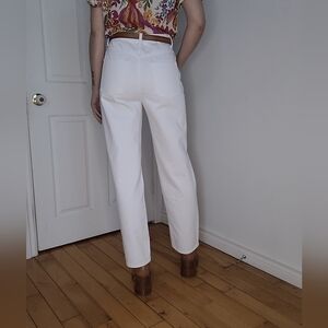 These distressed white jeans by Lovers and Friends showcase a high-rise fit with stylish knee rips, adding a touch of edgy flair to a classic straight-leg design. Made from 100% cotton, they offer both comfort and durability. These jeans are brand new with tags, perfect for casual outings or layering with your favorite top.