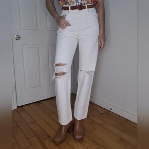 Distressed white jeans with knee rips