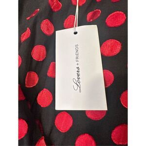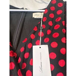 Brand new with tags, this stunning Augustus Gown by Lovers and Friends features a striking black fabric with bold red polka dots. Designed with sheer long sleeves, a flattering V-neckline, and a built-in liner for coverage and comfort. The fashion dress is crafted from a blend of polyester and viscose, offering a lightweight and elegant drape. Finished with an asymmetrical hem and a subtle slit for a touch of drama. Size XXS – perfect for your next special occasion or evening out.