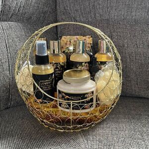 New, unused gift set of sweet almond smelling, shower gel, hand soap, shampoo, bubble bath, body mist, body scrub, bath oil, bath salt, bath bomb and bath puff.. PLUS the gold basket itself!