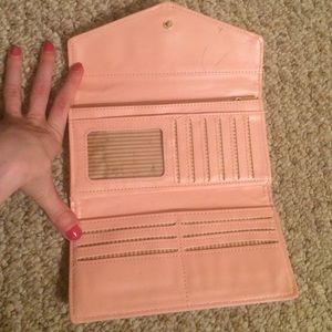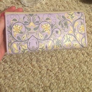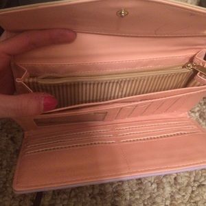 Cute wallet with tan and purple design on the outside and pink on the inside. Lots of cards space and a zipper pouch on the inside as well! Gently used, there is one flaw on the inside of the wallet where there is a pen mark on the top flap(as seen in second to last picture ) . Other than that it's in great condition!