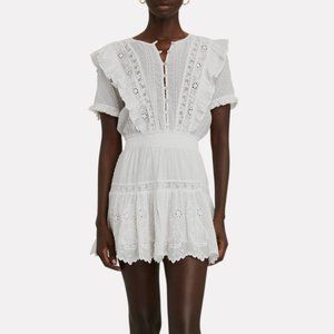 A leg-lengthening mini in Swiss dotted cotton gauze, the label's Sheldon dress is a breezy go-to with embroidered eyelet trim and lightly puffed sleeves. Partial button front closures. Elasticized waistband. Pull-over style.