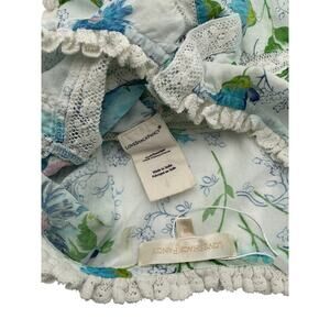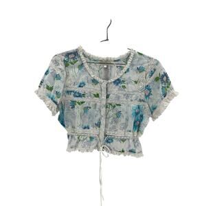 Loveshackfancy 'Farley' White Cotton Crop Top Size M: front button closure, front tie detail, lightweight linen fabric with floral design and crochet trim.