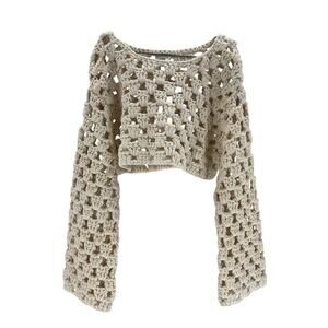 Loveshackfancy 'Keely' Beige Cotton Crochet Crop Pullover Sweater Size XS: cropped top, long bell sleeves, measurements: 21.5 inch bust x 11 inch length.