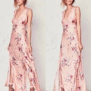 Wore once for a wedding. Fabric is real silk, in discontinued duchess print. Super flattering v-neck and leg slits with adjustable tie waist. Tag says medium but fits more like a small.