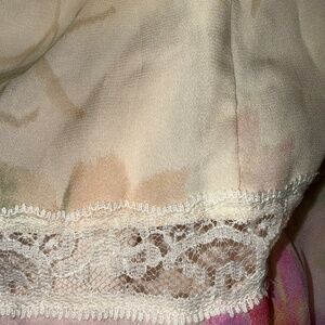 Ready for romance in the Roupell Dress. The stunning maxi arrives with a printed viscose rayon chiffon fabric featuring our large scale dreamy floral print mix in pink, cream, and a light green colorway. This sweeping dress begins with a v-neckline lined with lace and a lace-trimmed waist seam. The dress falls to a beautiful, flowy skirt. Cult following, gorgeous. Lovely, never worn. Sweater cardigan paired with dress also available.