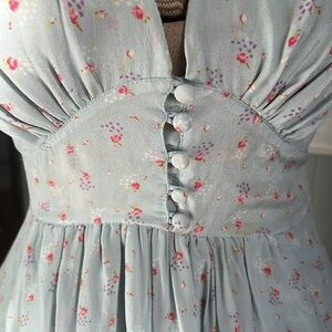 This dress is beautiful and Elegant. Super cute puff quarter sleeves. Plunging V-neck neckline with five buttons in the center. Side zipper closure. Lined skirt.