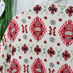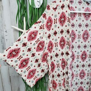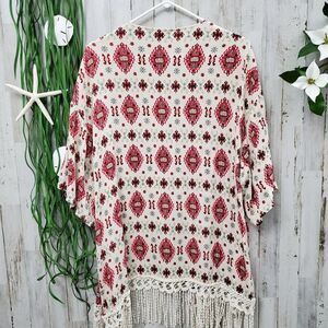 Lovesick Boho Fringe Cardigan Kimono Ivory & Red Patterned.