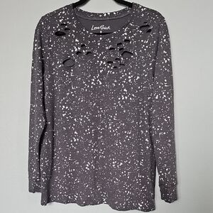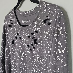 Elevate your casual wardrobe with the Lovesick Gray Graphic Long sleeve tee, featuring unique cut-out details and a bold graphic design. This long-sleeve top offers a comfortable fit, perfect for everyday wear. The artistic elements add a touch of flair to your style. Great for casual wear. Does stretch. Good condition. Silver details. Very comfortable. Casual, weekend, grunge, goth, punk, lounge, curvy, plus, neutral.